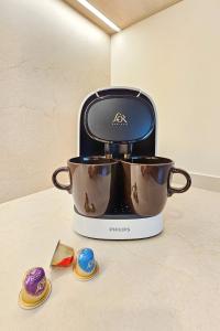 Inside the apartment, guests will find one bedroom alongside a living room equipped with satellite TV and a sofa bed. The fully fitted kitchen includes an oven, stovetop, dishwasher, refrigerator, microwave, coffee machine, electric kettle, toaster and dining table complete with kitchenware for self-catering needs. Additional comforts include heating, ironing facilities with iron and board, washing machine, clothes drying rack, wardrobe space and baby cot availability.