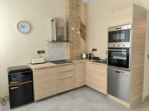 Los huéspedes pueden preparar sus comidas en la cocina americana totalmente equipada con horno, placas vitrocerámicas, lavavajillas, nevera, microondas, cafetera (con infusiones disponibles), menaje completo y tostadora. Otras comodidades incluyen lavadora, secadora, cuna disponible bajo petición, suelos en baldosa o mármol por todo el espacio, enchufes junto a la cama, WiFi en todas las zonas accesibles también para personas en silla de ruedas desde planta baja.